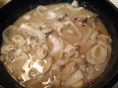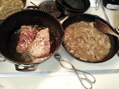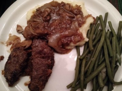 1 pound elk roast, cut into 6 steaks, about 1/2 inch thick 1 cup crushed crackers 1/2 cup olive oil (instead of Canola) 2 tablespoons butter 2 medium onions, sliced 2 cans mushrooms (or 2 cups of fresh) 1 tablespoon whole wheat flour 2 cups beef broth made from beef base 1 tablespoon Worcestershire sauce 1 teaspoon fresh thyme 1 teaspoon kosher salt 1 teaspoon ground black pepper I tenderized the steaks with a blade tenderizer. You can use a mallet and pound it. Saute mushrooms, onions and thyme in butter. If using canned, add them in the end. When the onions are softened, sprinkle all with the flour and stir in the broth. Boil until the gravy thickens. Add Worcestershire sauce and salt to taste. Simmer, adding more beef broth, if it gets too thick. You'll want plenty! Crush the crackers on a cutting board or large plate. Heat the oil in a skillet over medium heat. Press each tenderized steak into the crackers on boths sides. Gently lay the steaks in the skillet and cook until golden brown, about 4-5 minutes per side. Immediately lay the steaks in the gravy and cook for another 10 minutes. Serve with mashed potates. The potatoes and gravy became the focal point of the meal for us. Although, the steaks were awesome! Plenty of leftovers were welcome.