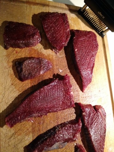 Venison Steak and GravyI recently adapted another one of Krysti Crabtree's recipes. She is the author of Nevada Foodies and Wild Game Cuisine, A Collection of Wild Game Recipes. The gravy was incredibly flavoful. I a couple of cups of beef broth (per Krysti's suggestion), because we wanted lots of gravy for mashed potatoes. This didn't thin the flavor at all, becaues it had cooked down a good bit.The crushed crackers added some great texture to the gravyu, but mostly fell off the steaks. However, it thickend the gravy nicely. I scooped out the chunks of crushed crackers left behind in the pan and added them to the delicious gravy.