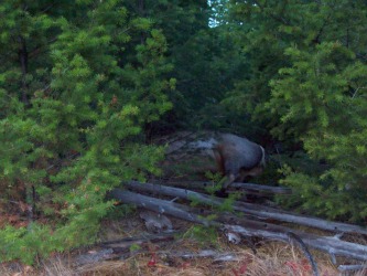 The blood trail will often involve spots of smeared blood as a part of the gut is dragged over logs, sticks or the ground. Give it at least four hours before starting to track the elk (two hours for a deer). Gut shot animals will die. They will also run, if pursued too soon.