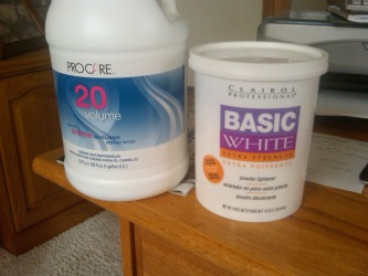 Put on your goggles for this step: Using the hair care products listed above (developer and whitener) mix the following into a non-metallic, glass or plastic bowl. 7 level scoops of basic white (the scoop comes in with the product) with 4.5 oz of 20 volume developer. Mix it into a rich, creamy consistency with a stick.