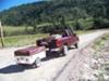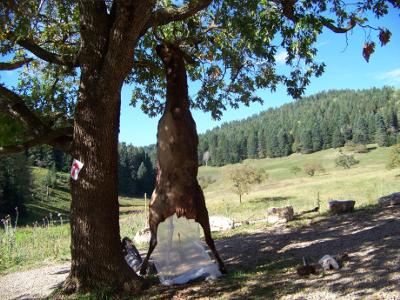 He found him down in a mud puddle on the trail. He was a young bull, 4 x 5. We field dressed him and pulled him back to camp where we hung him up in a tree in the middle of camp.