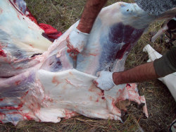 If a bull has been wallowing, the mud is usually dry and now the hide will be covered with thick dirt, which readily falls on your meat if you're not careful. I skinned a 5 X 6 in September of 2009 that was filthy. I used several pairs of latex gloves because the dirt covered the glove whenever I pulled on the hide.